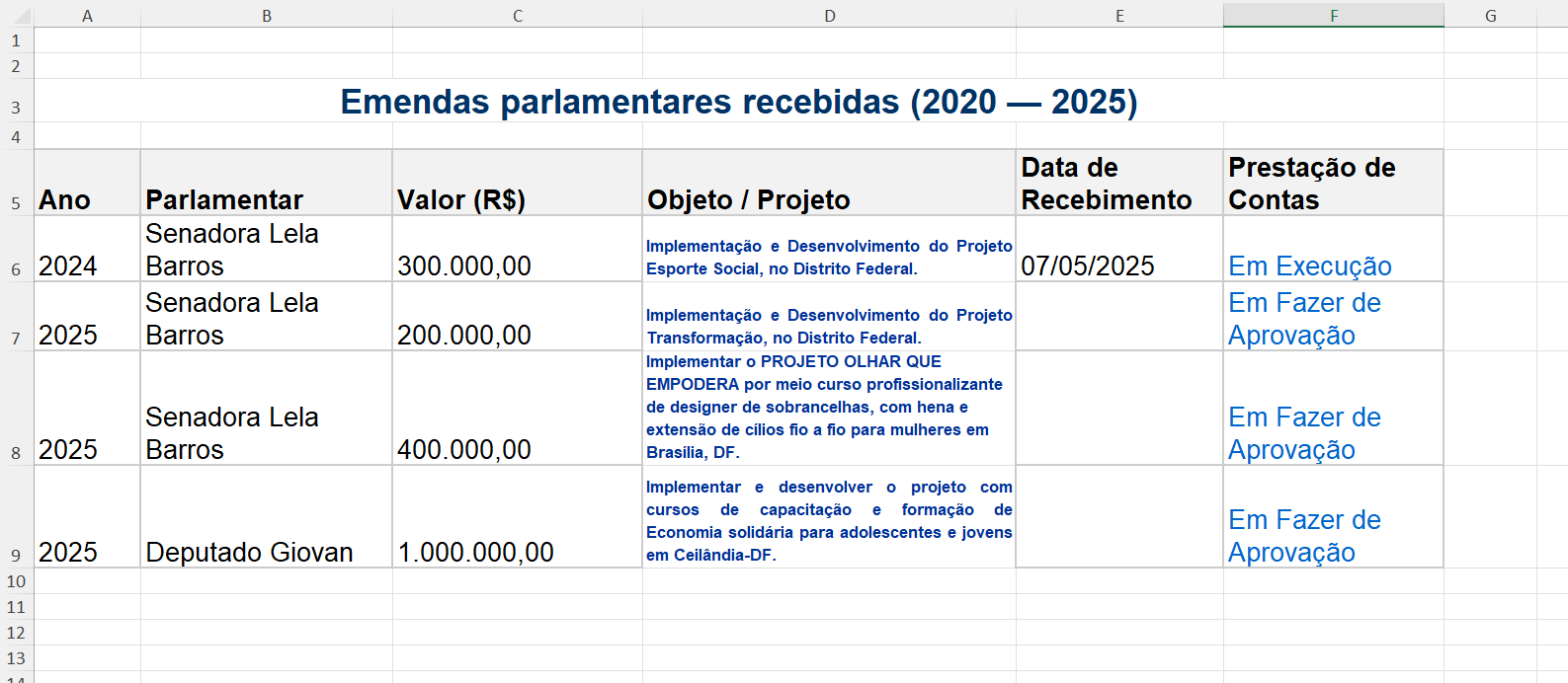 Visando garantir a transparência e o acesso público às informações, conforme estabelecido pelo Supremo Tribunal Federal, apresentamos a seguir o detalhamento das emendas parlamentares recebidas.